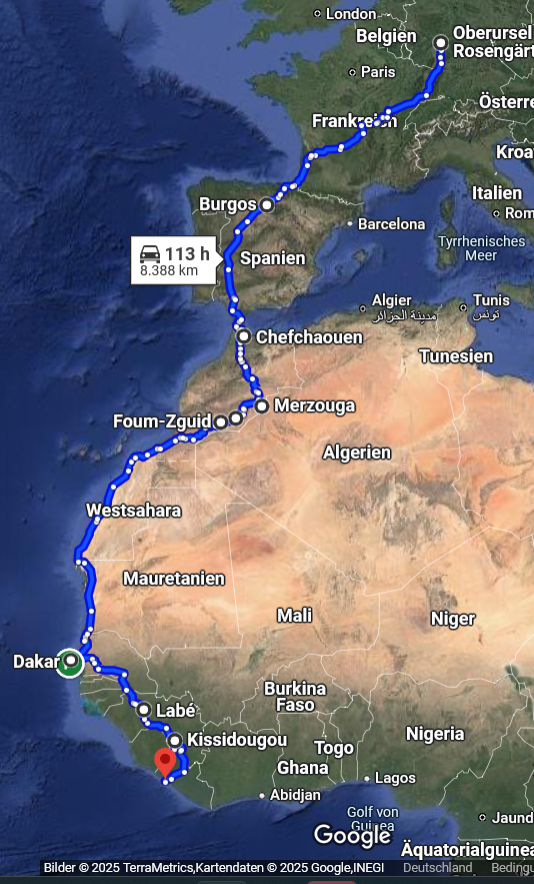 Wie die meisten Zugvögel entschieden wir uns für die Route durch die West-Sahara. Die Zentralsahara war für Individualreisende aus Sicherheitsgründen gesperrt. Inzwischen kann man Teile der algerischen Sahara wieder mit einem einheimischen, ortskundigen Führer bereisen. Mali gilt nach wie vor als unsicheres Terrain. Wir entschieden uns für die West-Route. Am 22. November 2023 starteten wir von meinem Heimatort Oberursel im Taunus auf diese große Fahrt. Unser Ziel: Liberia, wo meine Frau inzwischen über die Jahre mit Hilfe ihrer Schwester ein kleines Häuschen gebaut hatte. Dort wollten wir uns treffen und dann gemeinsam mit ihr und unserer afrikanischen Familie dort das Weihnachtsfest verbringen. Damit lagen die Route und der Ankunftszeitpunkt am Ziel fest. Wir hatten 31 Tage Zeit unser Ziel zu erreichen. Es war höchste Zeit - es konnte losgehen!